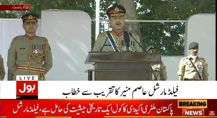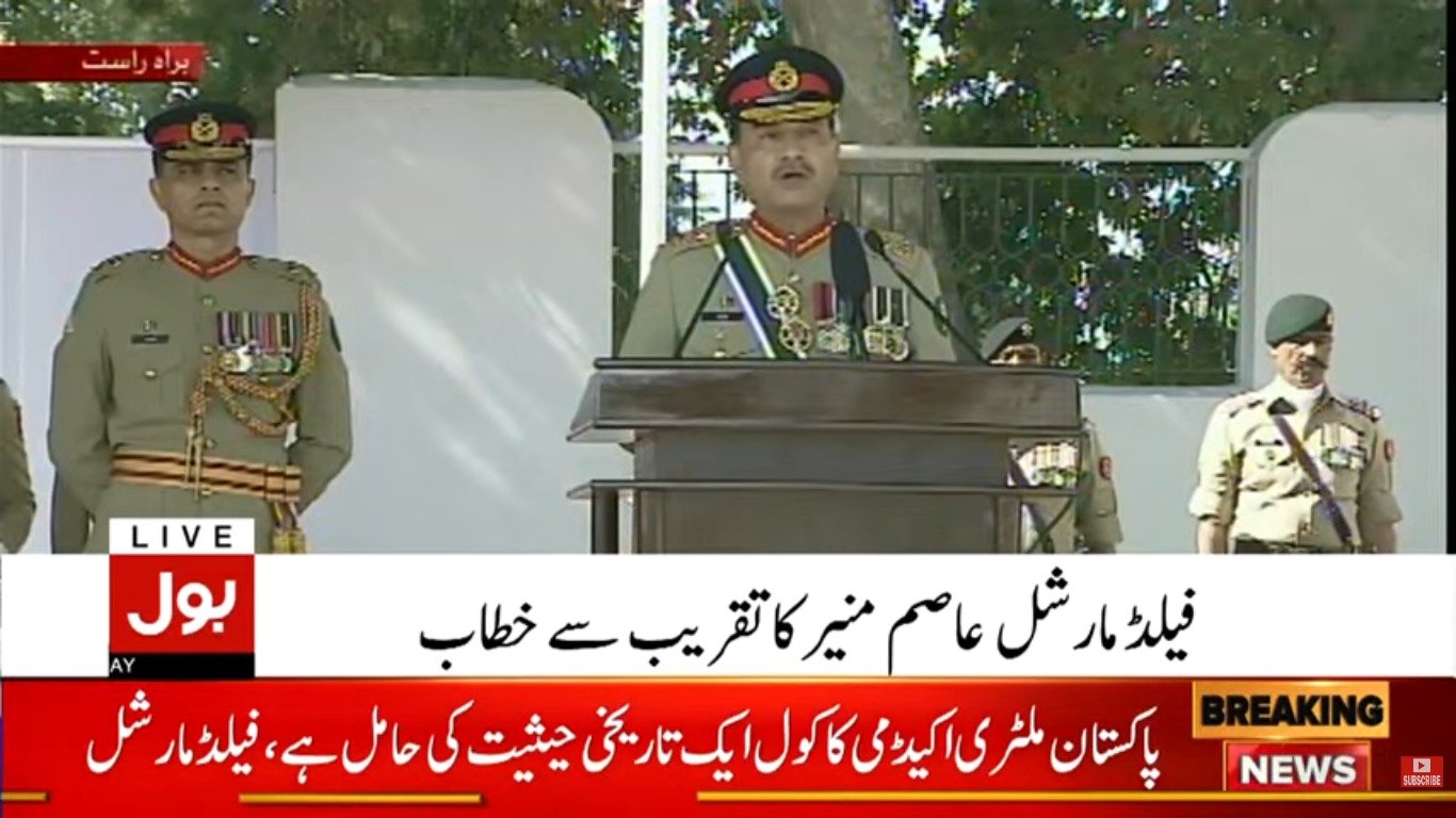 پی ایم اے کاکول کی پاسنگ آؤٹ پریڈ سے خطاب کرتے ہوئے آرمی چیف سید عاصم منیر نے کہا کہ معرکہ حق میں اپنی عسکری اور دفاعی صلاحیت کا لوہا منوایا،  آپریشن بنیان مرصوص کے دوران قوم اپنی فوج کے ساتھ فولاد کی طرح کھڑی تھی، آپریشن بنیان مرصوص سے قوم کے فوج پر اعتماد مزید مضبوط ہوا۔