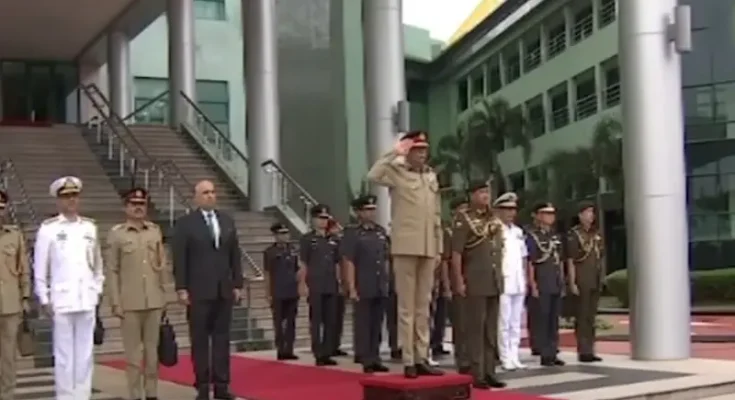 چیئرمین جوائنٹ چیفس کے رائل برونائی آرمڈ فورسز ہیڈکوارٹر پہنچنے پر ایک تربیت یافتہ فوجی دستے نے انہیں گارڈ آف آنر پیش کیا۔