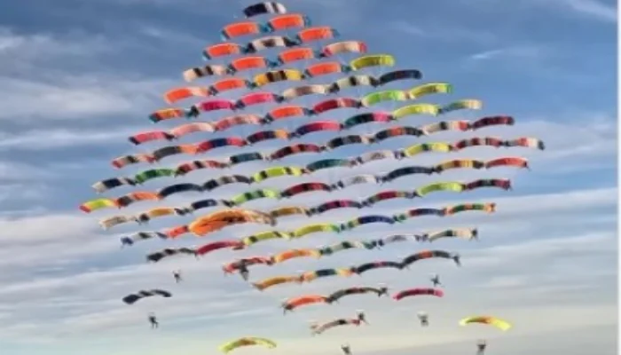 غیر معمولی کارنامے میں کھلاڑیوں نے اپنے پیراشوٹ ایک دوسرے سے انتہائی مہارت سے جوڑ کر دنیا کی سب سے بڑی Canopy Relative Work فارمیشن مکمل کی۔